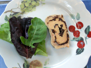 A ban on the sale of foie gras went into effect on July 1, 2012 in California, perhaps ending a long-standing annual tradition of cooking this delicacy for six food-loving friends. (See my story "On a Wild Goose Chase" for more about this tradition.) Sidney and I decided to celebrate one more time just before the ban went into effect. We invited the usual participants, plus a couple more, to our country house for the weekend. To get us in the mood, everyone gathered for a Saturday lunch of foie gras pizza from my wood-burning oven. Another foie gras preparation would start our evening meal and I wanted it to be spectacular— something new, something startling, something exotic. A recipe in Jean-Charles Karmann’s book Les Meilleures Recettes de Foie Gras (Paris: Editions de La Martinière, 2010) caught my eye. It reminded me of the countless bûches de Nöel we made during the winter holiday season when I had a bakery. One version, chocolate mousse enclosed in a thin sheet of almond biscuit, was a favorite. In the book’s recipe flattened foie gras took the place of the biscuit. It would be like a bûche but savory instead of sweet.
